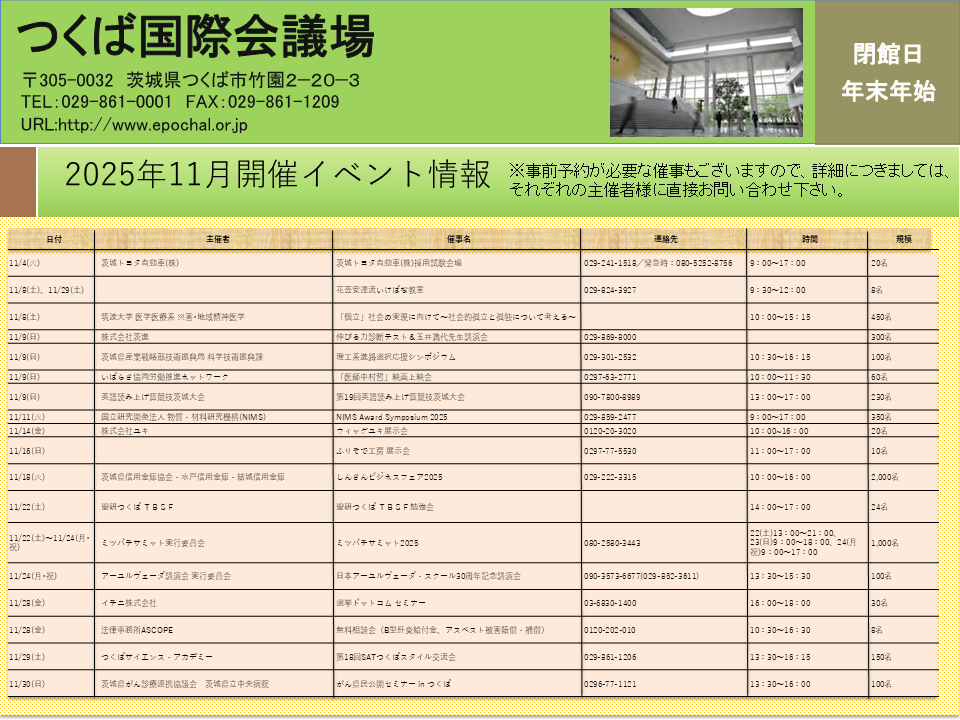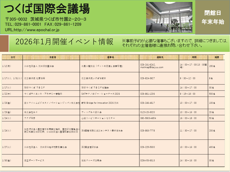 つくば都市交通センターでは、南1駐車場 に設置している掲示板を活用し、つくばセンター地区のイベント情報等、地域活性化につながる情報発信を行っています。掲示板へのポスター等の掲示をご希望のお客様は、下記事項を記載の上、メールにてお問合せください。