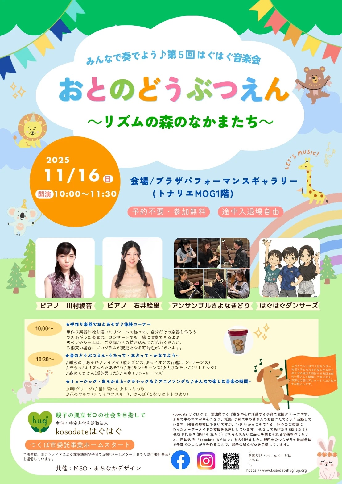 手作り楽器のワークショップや、動物たちをテーマにした楽しいコンサートタイムなど、親子で一緒に参加できる内容が盛りだくさん!