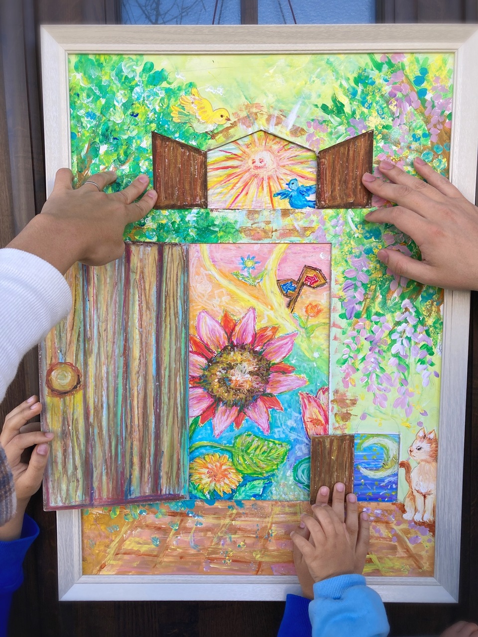 2枚を重ねて、実際に扉や窓を開くことのできる楽しいアート作品です。