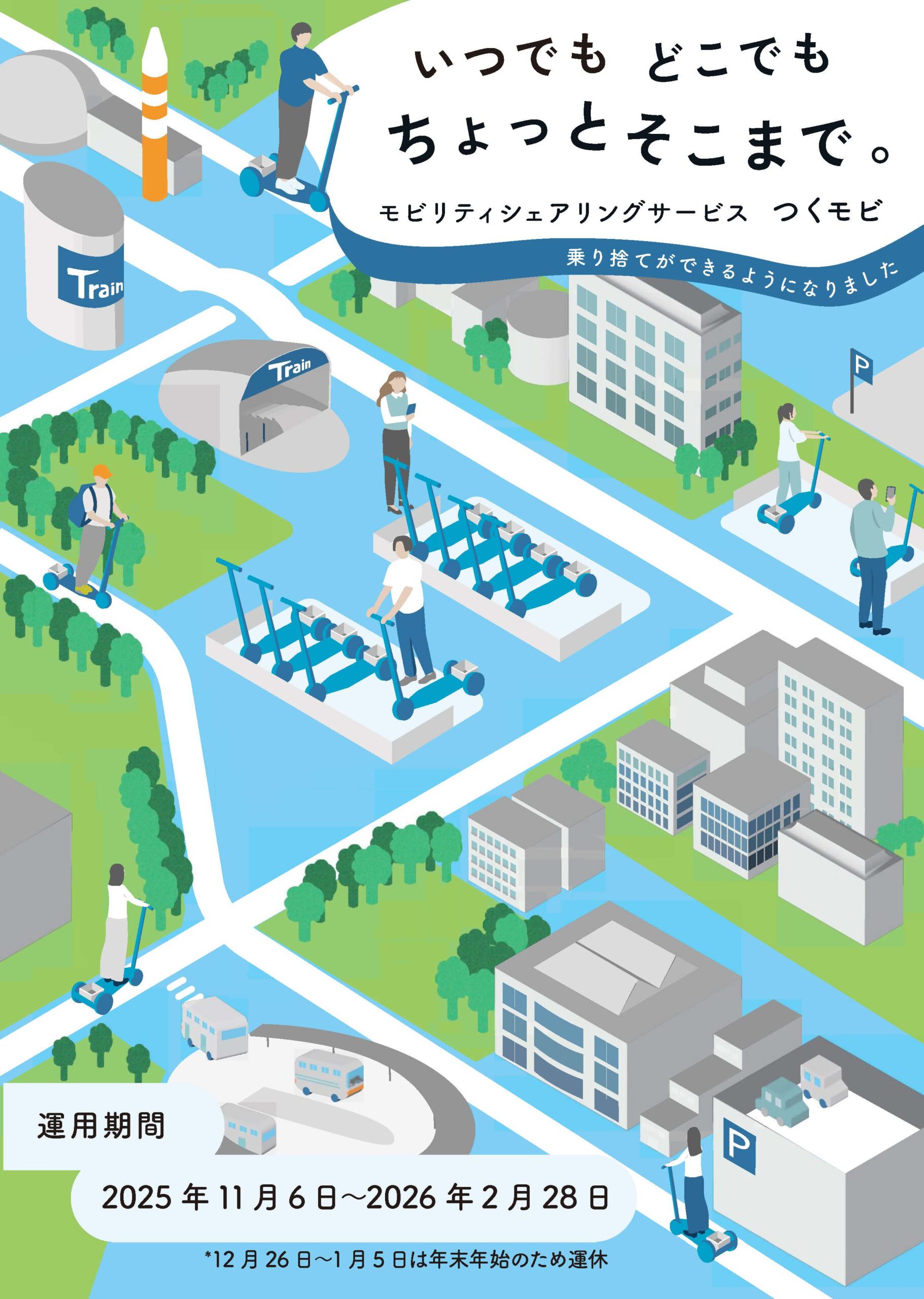 「つくモビ」は、つくば市内を自由に移動できるパーソナルモビリティ・シェアリングサービスです。