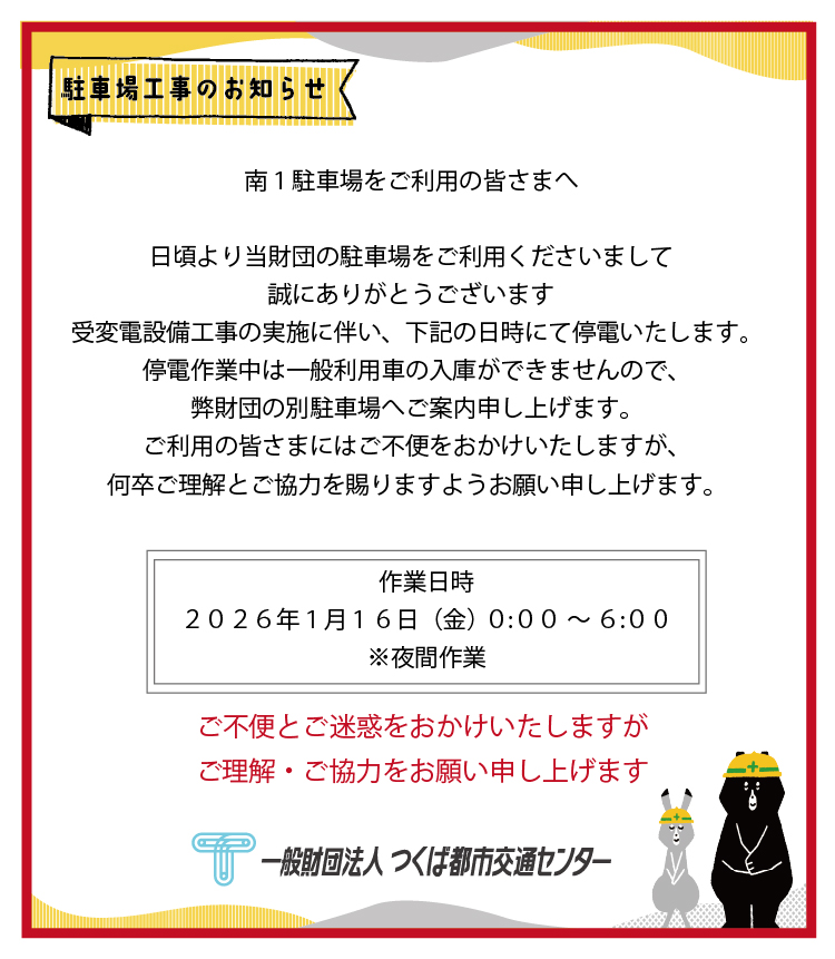 日頃より当財団の駐車場をご利用くださいまして誠にありがとうございます。受変電設備工事の実施に伴い、下記の日時にて停電いたします。停電作業中は一般利用車の入庫ができませんので、弊財団の別駐車場へご案内申し上げます。ご利用の皆さまにはご不便をおかけいたしますが、何卒ご理解とご協力を賜りますようお願い申し上げます。