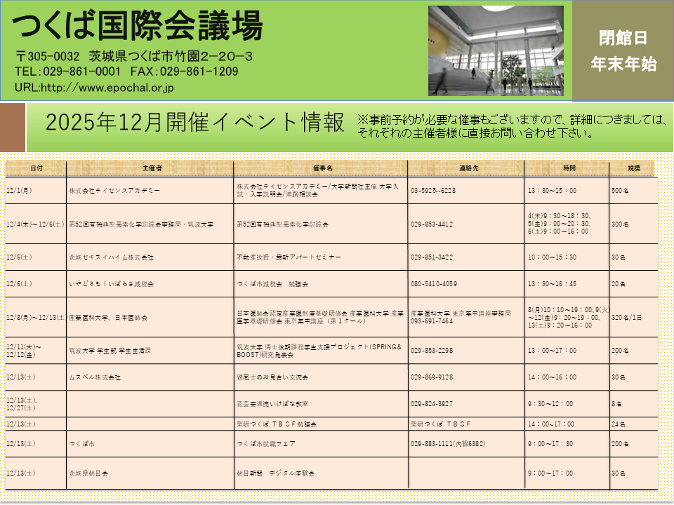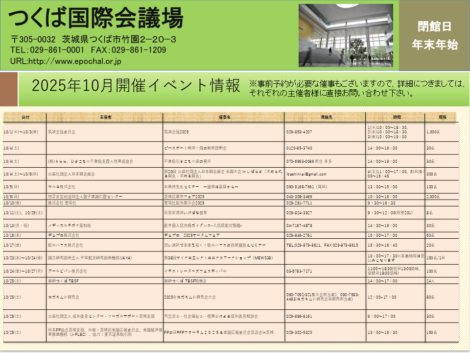 つくば都市交通センターでは、南1駐車場 に設置している掲示板を活用し、つくばセンター地区のイベント情報等、地域活性化につながる情報発信を行っています。掲示板へのポスター等の掲示をご希望のお客様は、下記事項を記載の上、メールにてお問合せください。